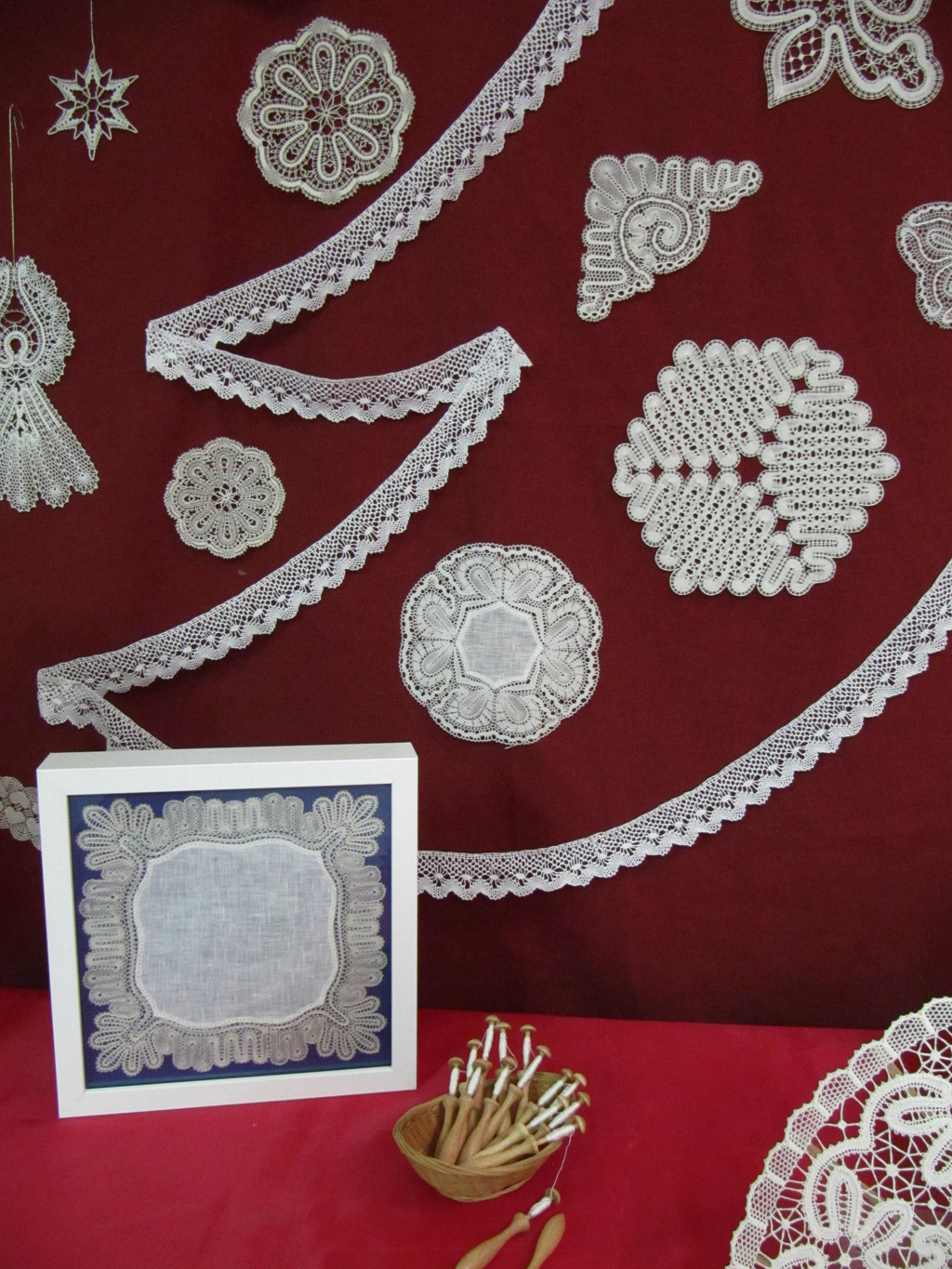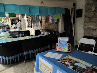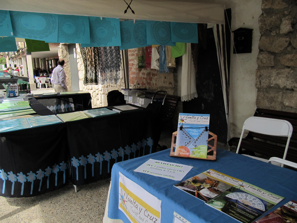 En cuanto a los puestos de venta, hubo pocos, pero selectos. Dos puestos de venta de hilos variados, bolillos decorados, artilugios novedosos para separar los hilos, todo tipo de enganches para hacer joyas de encaje... El puesto de Elena Díaz, con sus patrones originales e hilos para realizarlos. Y Vuelta y Cruz, nuestra revista de encaje de bolillos, que también quisimos estar presentes en este encuentro que está empezando a adquirir fama de acogedor.